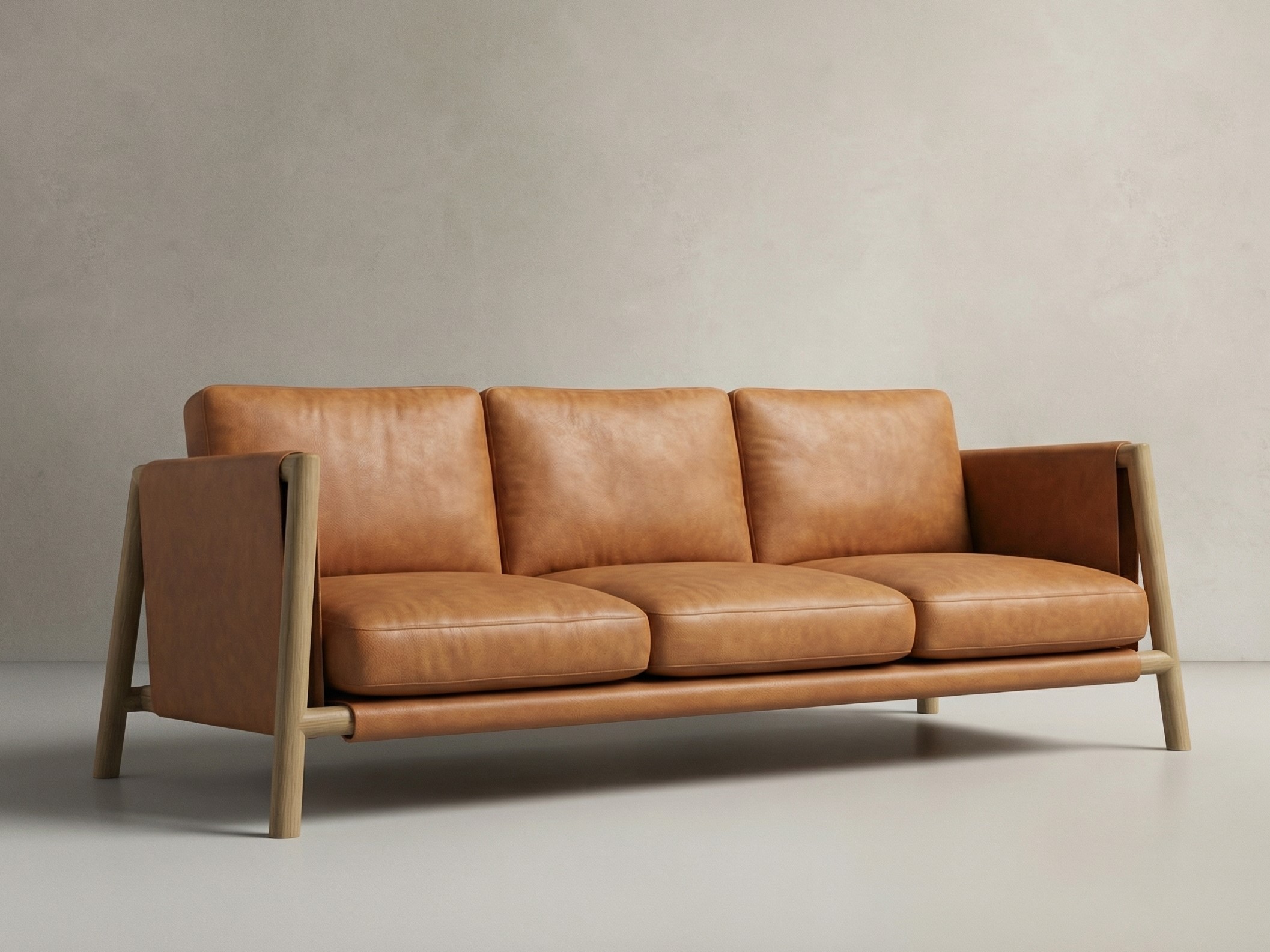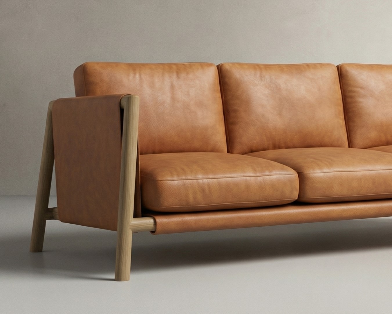 The frame is crafted from solid Light Oak, treated with a natural oil finish. This premium detail enhances the wood’s beautiful grain and provides an elegant contrast to the lush upholstery. The cushioning is realized in rich, top-grain aniline leather, chosen for its supple hand and graceful aging.