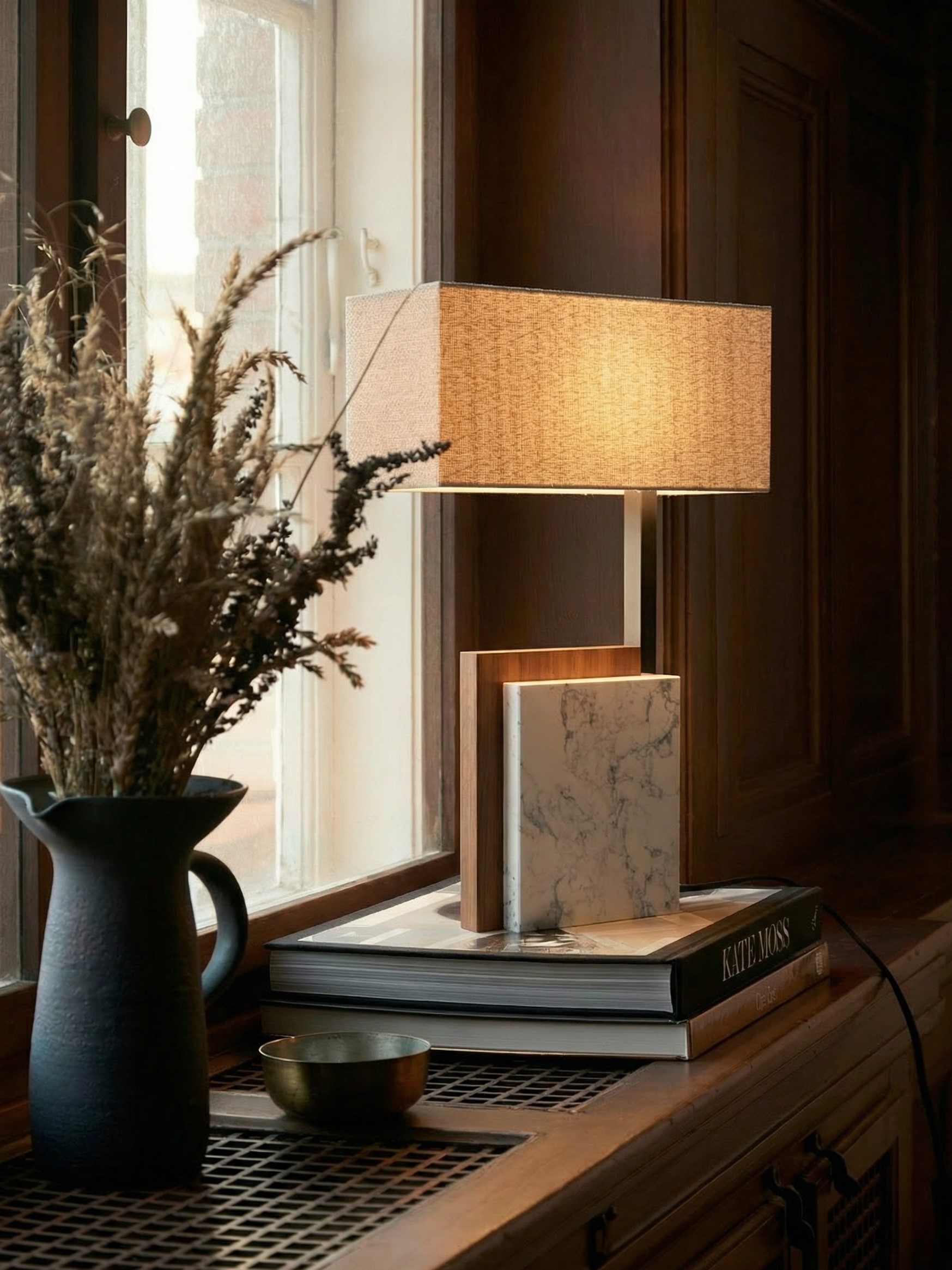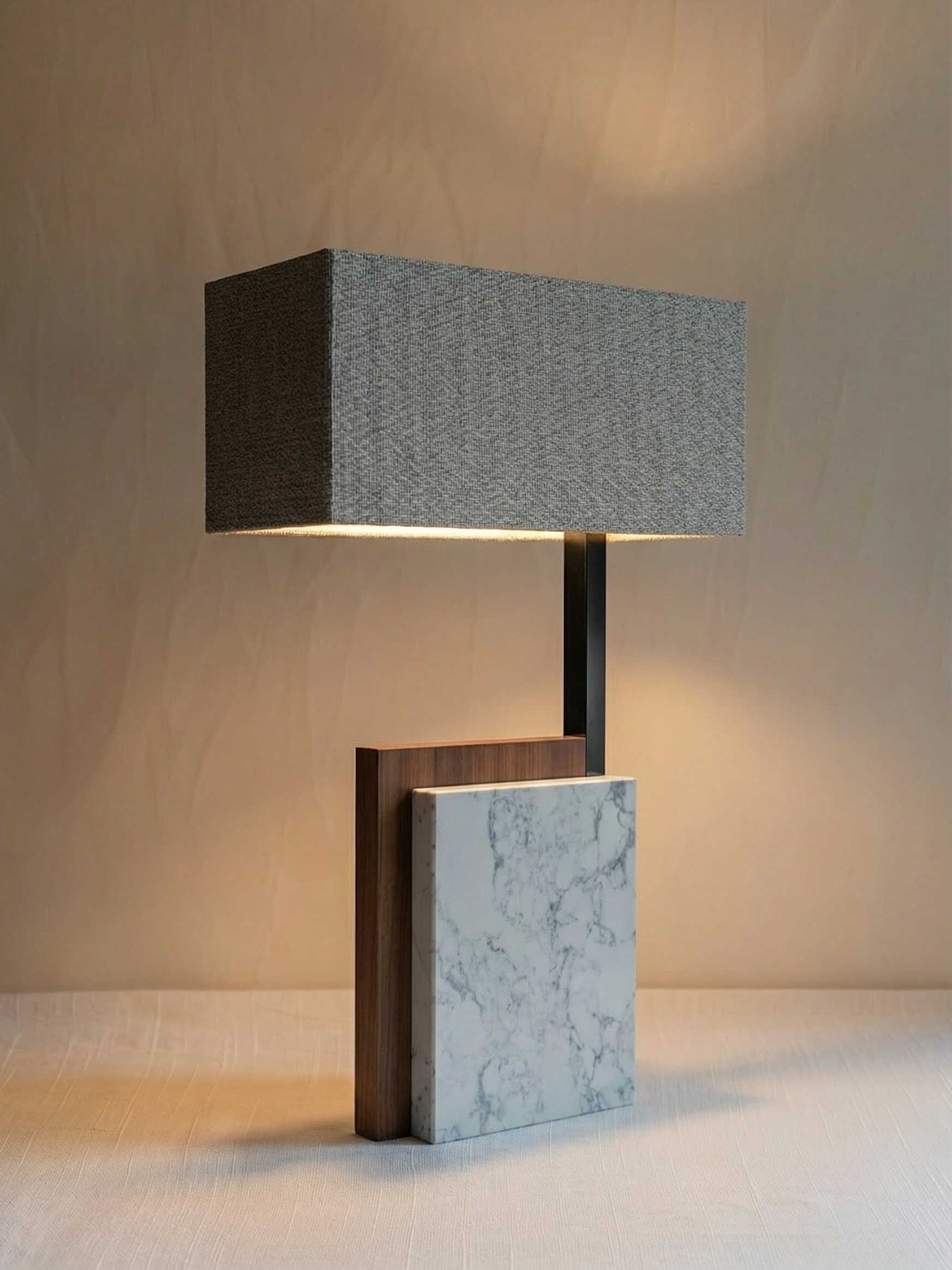The tall, rectangular shade is clad in a natural, woven linen or jute fabric. Its clean, rectilinear silhouette contrasts with the organic base materials, casting a beautifully warm, diffused light. The Repton lamp is an ideal choice for the client who appreciates quiet luxury and materials that tell a story.